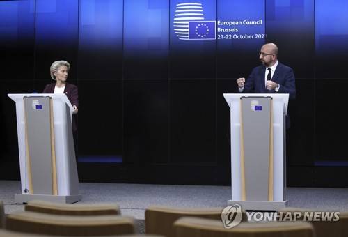 European Council President Charles Michel, right, and European Commission President Ursula von der Leyen participate in a media conference at an EU summit in Brussels, Friday, Oct. 22, 2021. European Union leaders concluded a two-day summit on Friday in which they discussed issues such as climate change, the energy crisis, COVID-19 developments and migration. (AP Photo/Olivier Matthys, Pool) POOL PHOTO