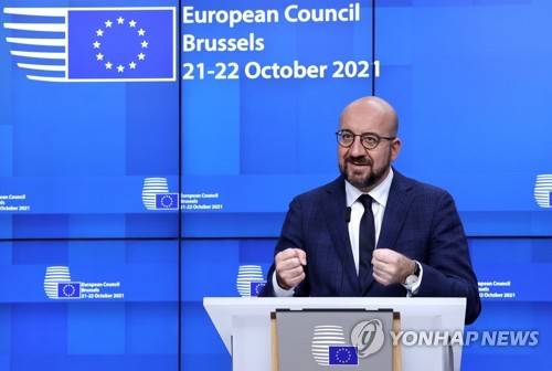 epa09539175 European Council President Charles Michel speaks during a media conference at an EU summit in Brussels, Belgium, 22 October 2021. European Union leaders concluded a two-day summit, on 22 October 2021, in which they discussed issues such as climate change, the energy crisis, COVID-19 developments and migration. EPA/Olivier Matthys / POOL