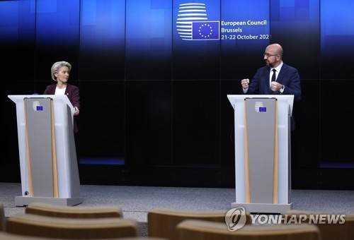 epa09539174 European Council President Charles Michel (R), and European Commission President Ursula von der Leyen participate in a media conference at an EU summit in Brussels, Belgium, 22 October 2021. European Union leaders concluded a two-day summit, on 22 October 2021, in which they discussed issues such as climate change, the energy crisis, COVID-19 developments and migration. EPA/Olivier Matthys / POOL