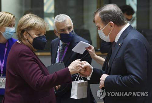 Germany's Chancellor Angela Merkel, left, greets Sweden's Prime Minister Stefan Lofven during a round table meeting at an EU summit in Brussels, Friday, Oct. 22, 2021. European Union leaders conclude a two-day summit on Friday in which they discussed issues such as climate change, the energy crisis, COVID-19 developments and migration. (John Thys, Pool Photo via AP) 12345678