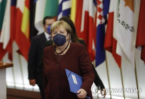 epa09539219 Germany's Chancellor Angela Merkel at the end of second day of a European Union leaders meeting in Brussels, Belgium, 22 October 2021 . EU leaders meet in Brussels on 21 and 22 October, to discuss COVID-19, digital transformation, energy prices, migration, trade and external relations. EPA/OLIVIER HOSLET / POOL