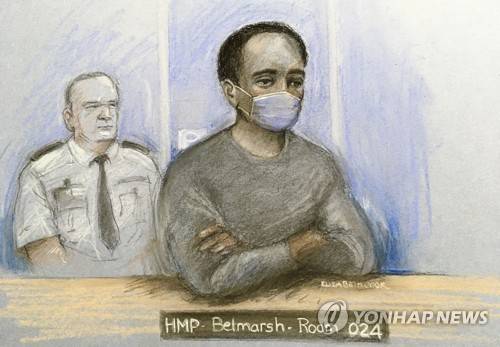 This court artist sketch by Elizabeth Cook shows Ali Harbi Ali appearing at the Old Bailey in London by video link from HMP Belmarsh, Friday, Oct. 22, 2021 charged with the terrorism-related murder of Southend West MP David Amess. (Elizabeth Cook/PA via AP) UNITED KINGDOM OUT NO SALES NO ARCHIVE PHOTOGRAPH CANNOT BE STORED OR USED FOR MORE THAN 14 DAYS AFTER THE DAY OF TRANSMISSION