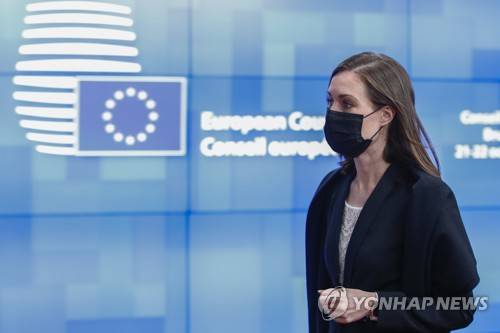 epa09539223 Finland's Prime Minister Sanna Marin departs after a face-to-face European Union leaders summit in Brussels, Belgium, 22 October 2021. EU leaders meet in Brussels on 21 and 22 October, to discuss COVID-19, digital transformation, energy prices, migration, trade and external relations. EPA/JOHANNA GERON / POOL