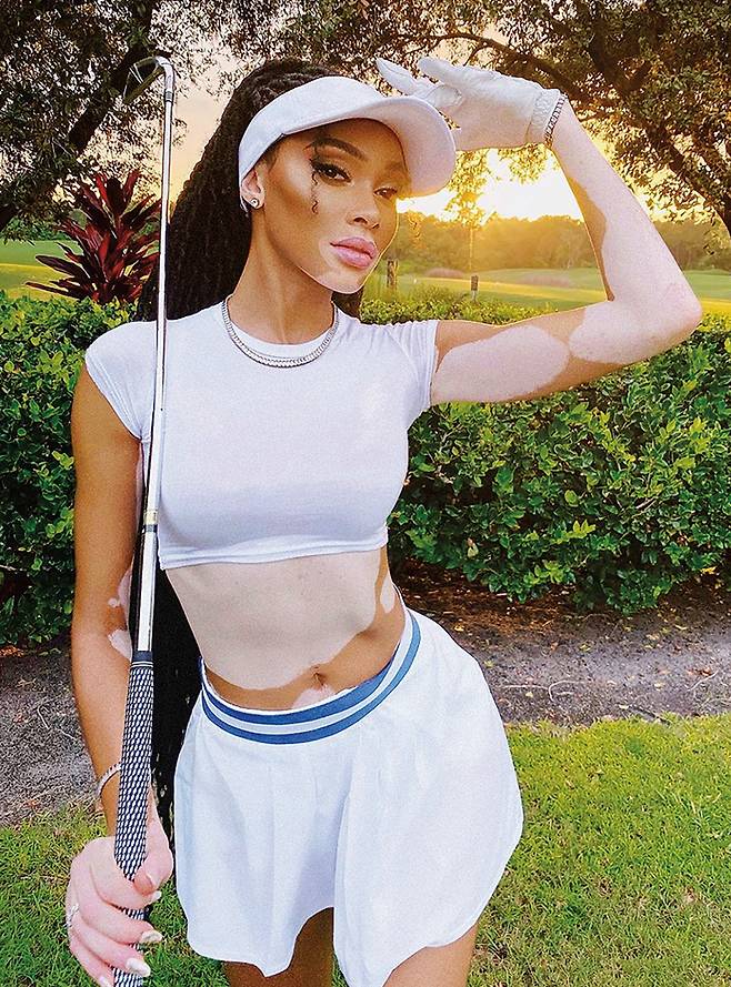숨길 수 없는 몸매 자랑 본능! 탄탄한 복부를 노출한 올 화이트 룩에 반짝이는 목걸이로 블링블링한 터치를 더했다. 하지만 위니, 너무 짧고 퍼지는 치마는 필드에 어울리지 않아요~.