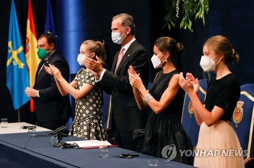 epa09539472 (L-R) Asturias region president Adrian Barbon, Leonor, Princess of Asturias, Spain's King Felipe VI, Queen Letizia and Infanta Sofia acknowledge the applause of the audience and welcome the laureates prior to the Princess of Asturias Awards ceremony at the Campoamor theater in Oviedo, Asturias, Spain, 22 October 2021. EPA/Ballesteros