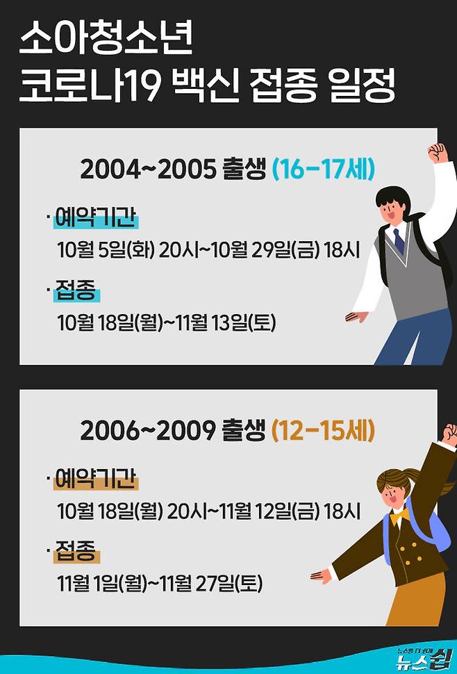 미국, 유럽, 이스라엘 등 주요 국가들은 지난 5월부터 12세 이상 소아 청소년의 예방접종을 시작했다. 우리나라도 초등학교 6학년부터 고등학교 2학년에 해당하는 12~17세 (2004~2009년생) 어린이와 청소년의 백신 접종이 진행되고 있다. 16~17세에 대한 백신 접종이 시작됐고, 곧 12~15세도 접종을 앞두고 있다.