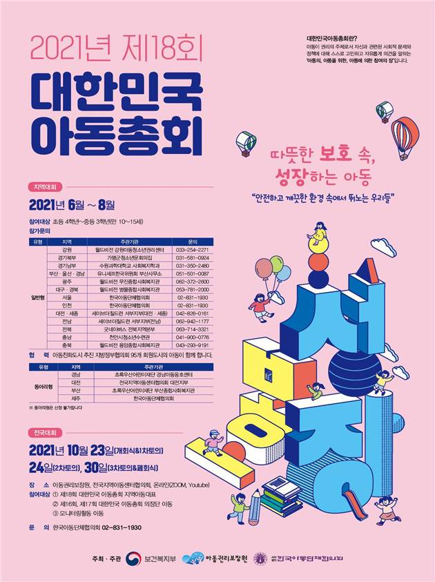 ‘대한민국 아동총회’는 전국 아동대표(만 10~17세)들이 모여 아동과 관련된 사회문제를 토의하는 ‘아동 참여권 행사의 장(場)’으로서 2004년에 처음 개최돼 올해 제18회를 맞는 행사다. 코로나19 상황을 고려해 올해 총회는 개회식에 이어 온라인(비대면)으로 3회(10월 23일, 24일, 30일)에 걸친 토의과정으로 진행될 예정이다.