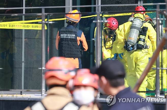 (서울=연합뉴스) 홍해인 기자 = 23일 오전 서울 금천구 가산동 데이터허브센터에서 이산화탄소 누출사고가 발생해 21명의 사상자가 발생했다. 이중 2명은 병원 이송 중 심폐소생술을 받았으나 사망한 것으로 확인됐다. 사진은 사고 발생 이후 중앙구조단 소방대원들이 화학복을 착용한 채 추가 인명 피해 여부를 확인하기 위해 사고 현장에 진입하는 모습. 2021.10.23