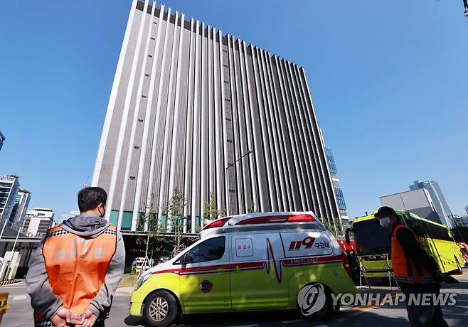 (서울=연합뉴스) 홍해인 기자 = 23일 오전 서울 금천구 가산동 데이터허브센터에서 이산화탄소 누출사고가 발생해 21명의 사상자가 발생했다. 이중 2명은 병원 이송 중 심폐소생술을 받았으나 사망한 것으로 확인됐다. 사진은 사고 현장을 오가는 119 구급 차량 모습. 2021.10.23