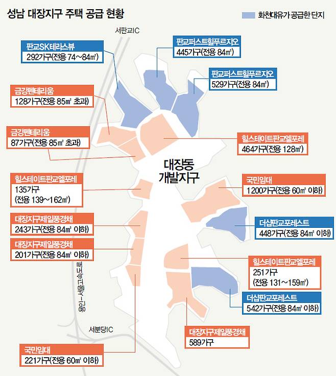 화천대유는 우선 공급받은 택지에서 직접 주택 사업을 했다. 화천대유가 시행해 지난 5월 입주한 아파트는 판교퍼스트힐푸르지오(974가구), 판교더샵포레스트(990가구)다. 두 단지는 2018년 말 분양했는데 3.3㎡당 평균 분양가는 판교퍼스트힐푸르지오가 2030만원, 판교더샵포레스트가 2080만원이었다. 앞서 2014년 대장동 공영 개발 구상을 발표하는 자리에서 이재명 당시 성남시장은 “3.3㎡당 1100만원대로 분양가를 정하겠다”고 밝혔지만 실제 분양가는 이보다 2배가량 높아진 셈이다. 비슷한 시기 분양한 위례신도시 위례포레자이 평균 분양가인 1820만원보다 높아 고분양가 논란이 일기도 했다.