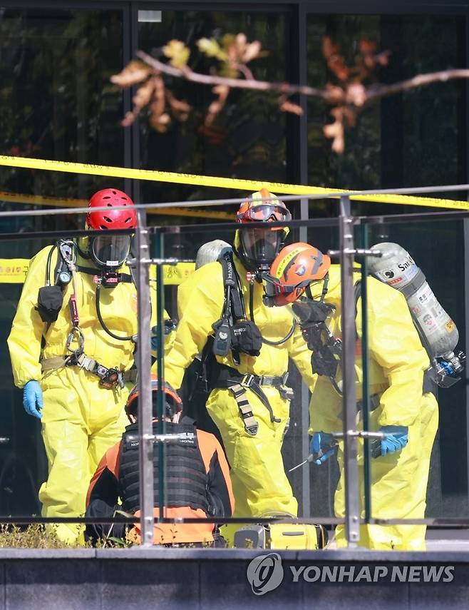 화학복을 착용한 중앙 119 구조대원들이 사고 현장에 대한 추가 수색을 마친 뒤 나오고 있다. 2021.10.23