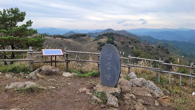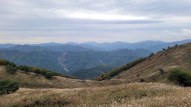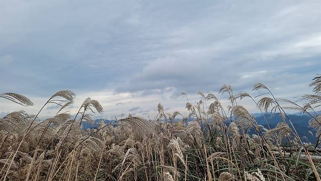 뛰다시피 올라가니 시야가 확 트이고 억새로 이루어진 평원 위를 걷고 있었다. 앞에는 완만한 능선을 따라 정상이 보이고 양옆은 출렁이는 억새 사이로 보이는 푸른빛 산맥이 조화를 이루고 있었다. 다만 억새를 빛내줄 햇살이 아쉬웠다.