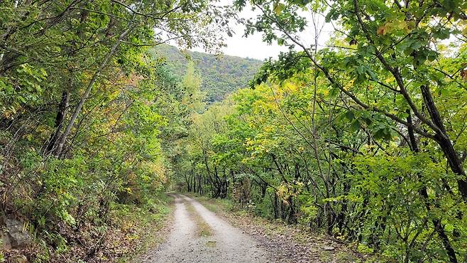 | ▲ 주막까지 차로 올라올 수 있는 임도 임도를 둘러싼 나무에 가을 색이 올라오고 있다 |