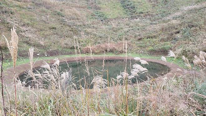 | ▲ 가까이에서 본 돌리네 큰 연못같다. 물이 맑아 거울처럼 억새를 비춘다 |
