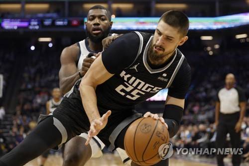 epa09540437 Sacramento Kings center Alex Len of Ukraine (R) in action against Utah Jazz forward Eric Paschall (L) during the first half of the NBA basketball game between the Utah Jazz and Sacramento Kings at the Golden 1 Center in Sacramento, California, USA, 22 October 2021. EPA/JOHN G. MABANGLO SHUTTERSTOCK OUT