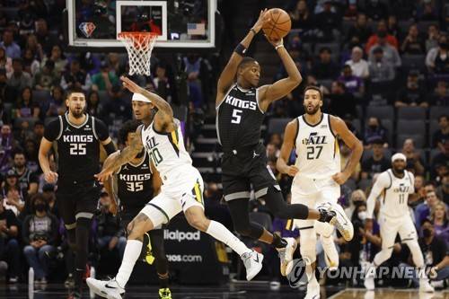 epa09540442 Sacramento Kings guard De'Aaron Fox (C-R) passes as Utah Jazz guard Jordan Clarkson (2-L) defends during the first half of the NBA basketball game between the Utah Jazz and Sacramento Kings at the Golden 1 Center in Sacramento, California, USA, 22 October 2021. EPA/JOHN G. MABANGLO SHUTTERSTOCK OUT