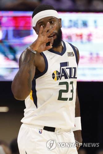 epa09540444 Utah Jazz forward Royce O'Neale reacts after making a three-point shot against the Sacramento Kings during the first half of the NBA basketball game between the Utah Jazz and Sacramento Kings at the Golden 1 Center in Sacramento, California, USA, 22 October 2021. EPA/JOHN G. MABANGLO SHUTTERSTOCK OUT