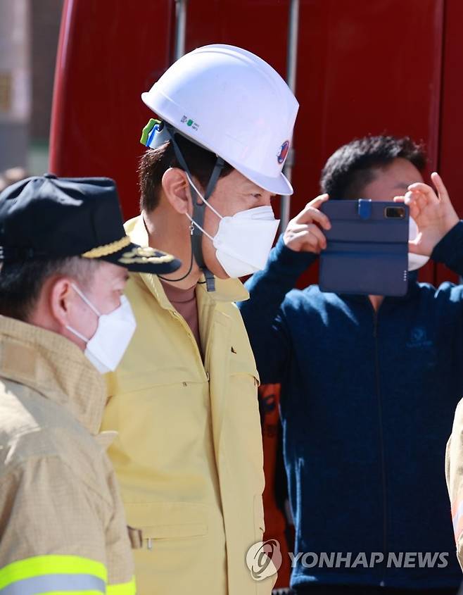 (서울=연합뉴스) 홍해인 기자 = 오세훈 서울시장이 23일 오전 이산화탄소 누출사고가 발생한 서울 금천구 가산동 데이터허브센터를 방문해 소방관계자들로부터 현장 보고를 받고 있다.