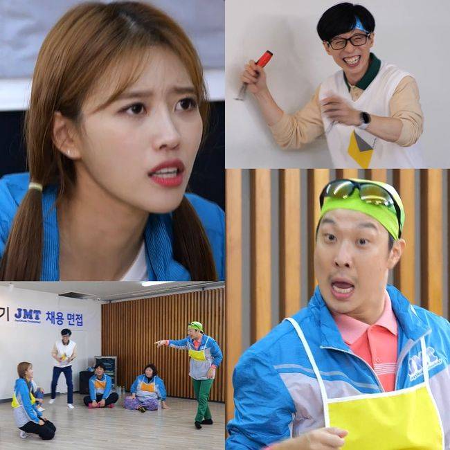 공개된 사진 속에는 JMT 면접생들의 팀워크와 소통, 돌파 능력을 테스트하기 위한 ‘스피드 게임’ 현장이 담겨 있다. ‘스피드 게임’은 두 팀으로 나눠 진행됐는데, 하사원(하하)-미주-이은지, 정과장(정준하)-신기루-이용진이 각 팀을 이뤘다.