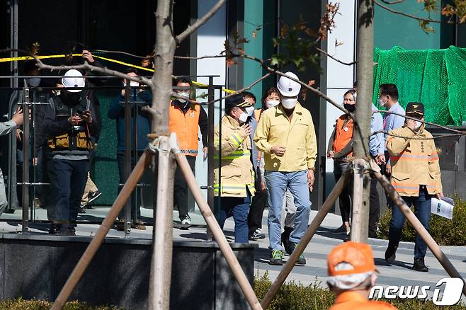 (서울=뉴스1) 유승관 기자 = 오세훈 서울시장이 23일 이산화탄소 누출 사고가 발생한 서울 금천구 가산동의 한 건물 신축공사 현장을 찾아 현장을 둘러본 후 이동하고 있다.