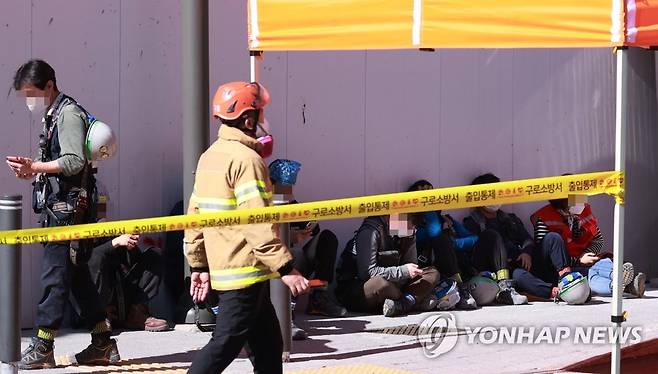 (서울=연합뉴스) 홍해인 기자 = 23일 오전 이산화탄소 누출사고가 발생한 서울 금천구 가산동 데이터허브센터 앞에 건물에서 일하던 작업자들이 이산화탄소 중독 여부를 확인 받은 뒤 자리에 앉아 있다.