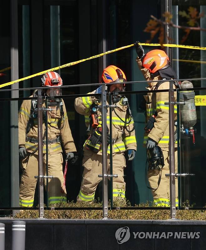 (서울=연합뉴스) 홍해인 기자 = 23일 오전 이산화탄소 누출사고가 발생한 서울 금천구 가산동 데이터허브센터에서 소방대원들이 나오고 있다.