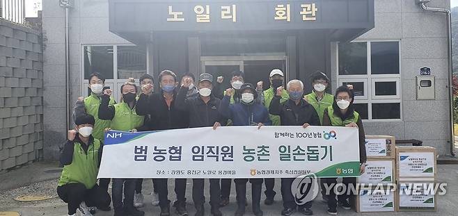 (서울=연합뉴스) 22일 농협경제지주 축산컨설팅부 직원들이 강원도 홍천 풍경마을을 방문해 농촌 일손돕기 활동을 펼친 뒤 기념촬영을 하고 있다. 2021.10.23 [농협 제공, 재판매 및 DB 금지]