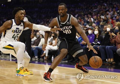 epa09540471 Sacramento Kings forward Harrison Barnes (R) in action against Utah Jazz guard Donovan Mitchell (L) during the first half of the NBA basketball game between the Utah Jazz and Sacramento Kings at the Golden 1 Center in Sacramento, California, USA, 22 October 2021. EPA/JOHN G. MABANGLO SHUTTERSTOCK OUT