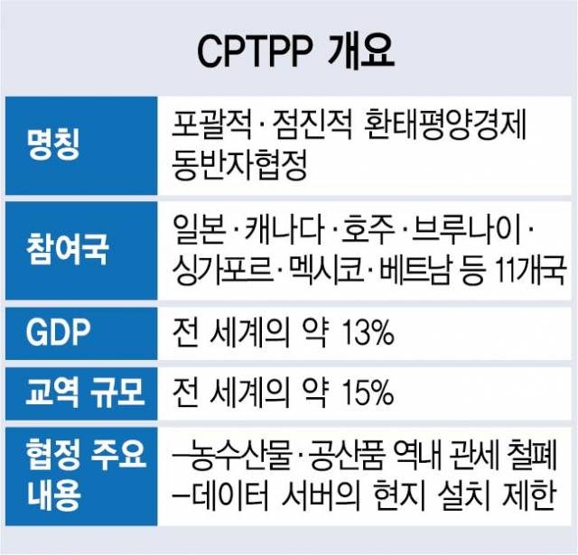 그럼에도 정부는 내달 대외경제장관회의에서 포괄적·점진적 환태평양동반자협정(CPTPP) 가입 신청을 공식화할 예정입니다. 일본이 미적지근한 반응을 보이고 있어 협정 참여를 장담하기 어려운 상황이지만 중국과 대만이 잇달아 가입 신청서를 제출하면서 더 늦추기는 어렵게 된 탓입니다. 자칫 아시아 태평양 지역 내 최대 경제 공동체에서 배제될 수 있다는 우려의 목소리가 정부 내에서도 나오고 있기 때문입니다.