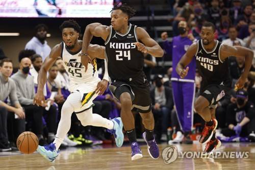 epa09540501 Utah Jazz guard Donovan Mitchell (L) drives up court as Sacramento Kings guard Buddy Hield of the Bahamas (C) defends during the second half of the NBA basketball game between the Utah Jazz and Sacramento Kings at the Golden 1 Center in Sacramento, California, USA, 22 October 2021. EPA/JOHN G. MABANGLO SHUTTERSTOCK OUT