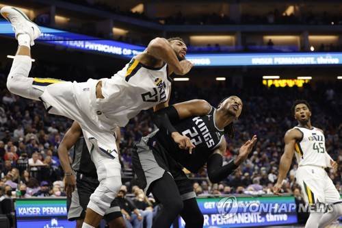 epa09540502 Utah Jazz center Rudy Gobert of France (L) draws a foul by Sacramento Kings forward Richaun Holmes (C) during the second half of the NBA basketball game between the Utah Jazz and Sacramento Kings at the Golden 1 Center in Sacramento, California, USA, 22 October 2021. EPA/JOHN G. MABANGLO SHUTTERSTOCK OUT