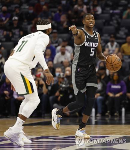 epa09540511 Sacramento Kings guard Tyrese Haliburton (R) goes up court as Utah Jazz guard Mike Conley (L) defends during the first half of the NBA basketball game between the Utah Jazz and Sacramento Kings at the Golden 1 Center in Sacramento, California, USA, 22 October 2021. EPA/JOHN G. MABANGLO SHUTTERSTOCK OUT