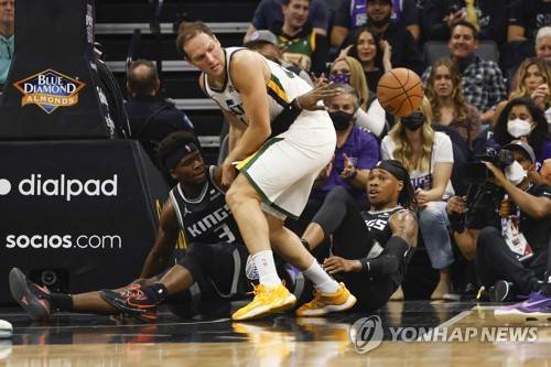epa09540513 Sacramento Kings guard Terence Davis II (L, bottom) passes the ball past Utah Jazz forward Bojan Bogdanovic of Croatia (C) during the first half of their NBA game at Golden 1 Center in Sacramento, California, USA, 22 October 2021. EPA/JOHN G. MABANGLO SHUTTERSTOCK OUT