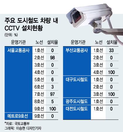 사정은 지방 도시철도도 마찬가지다. 부산도시철도의 경우 4호선에는 100% 설치돼 있지만 1호선에는 33%, 2호선과 3호선은 0%다. 대구도 3호선(100%)을 제외한 1,2호 선에는 단 한 대의 CCTV도 설치되지 않았고 광주와 대전 역시 CCTV 설치율은 0%다.