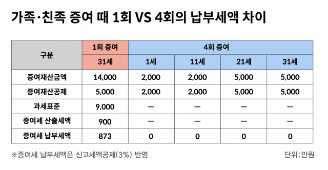위의 표에서는 자녀가 어릴 때부터 10년 단위로 증여재산 공제한도 만큼 증여를 꾸준히 실행한 경우(총4회에 걸쳐)와 자녀가 장성한 다음 한꺼번에 증여를 실행한 경우의 증여세 차이를 볼 수 있다. 증여재산 공제한도는 증여를 실행하지 않으면 소멸된다. 따라서 이를 염두에 두고 증여를 일찍부터 실행하고, 증여세 신고를 한다면 자녀명의의 합법적인 자산형성 근거와 출처가 된다.