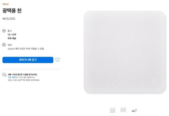 애플은 이달 19일 신제품 발표와 함께 기존에 판매하지 않던 고급 디스플레이용 '광택용 천'을 일반 사용자들에게도 제공하기 시작했다. 애플코리아 홈페이지 등을 통해 해당 제품 정보를 보면 무려 2만 5천원의 높은 가격에도 주문이 이어져 적어도 10주에서 최대 12주의 대기가 필요하다는 안내가 나온다.