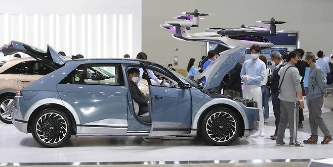 Hyundai Motor Group displayed its new electric vehicle IONIC5 along with a model of its E-pit station, which can charge 80 percent of the vehicle’s EV battery capacity within 18 minutes.