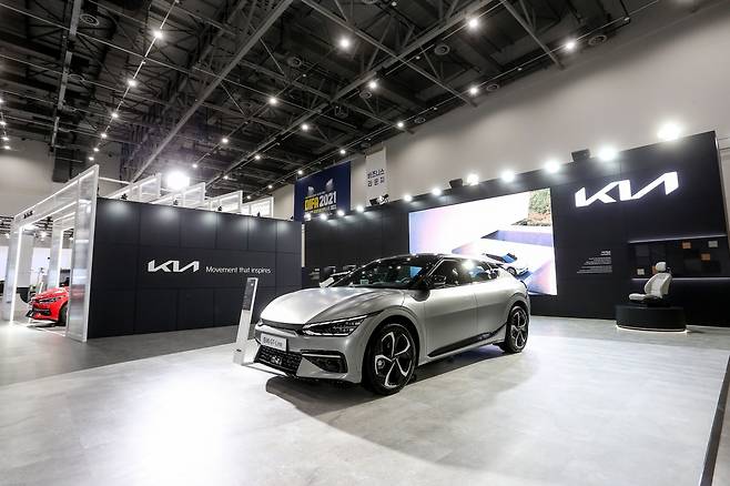 Kia Motors exhibited the EV6 electric vehicle, featuring eco-friendly fabric seats. Kia plans to debut the SUV version of the EV6 on the market next year.