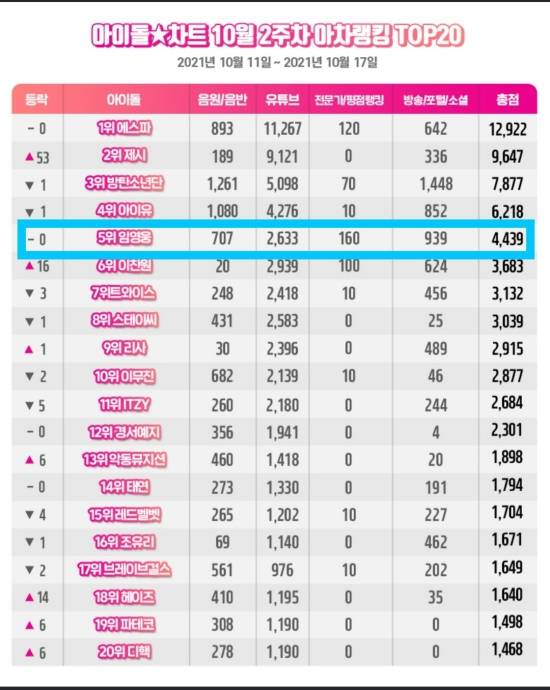 한편, 가수 임영웅은 10월 3주 차 아이돌차트 평점랭킹에서 최다득표자에 올랐다.