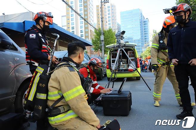 서울 구로소방서는 "23일 오전 8시53분 금천구 가산동의 한 건물 신축 공사 현장 지하 3층에서 화재 진압에 쓰이는 이산화탄소 설비가 터져 2명이 숨지고 2명이 중상을 입었다"고 밝혔다. (서울소방재난본부 제공) 2021.10.23/뉴스1