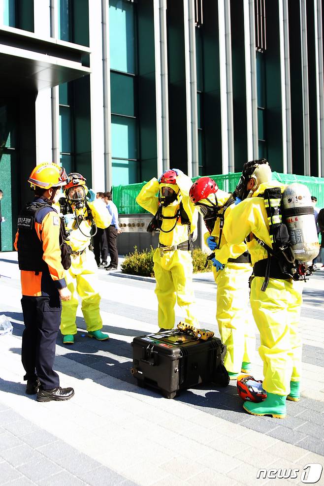 (서울=뉴스1) = 소방대원들이 23일 서울 금천구 가산동의 한 건물 신축공사 현장에서 발생한 이산화탄소 누출사고와 관련, 진압작전을 준비히고 있다.