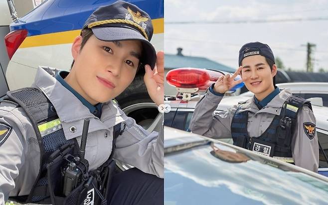 사진에는 촬영 중 파출소 막내 순경으로 변신한 김희재의 모습이 담겨있다.