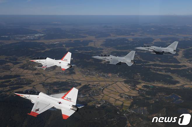 (서울=뉴스1) = 경기 성남시 서울 ADEX 2021 행사장에서 비행체험을 위해 이륙한 국산항공기 FA-50, T-50 4기 편대가 제8기 국민조종사들이 동승한채 대형을 유지하며 비행하고 있다. (공군 제공) 2021.10.23/뉴스1