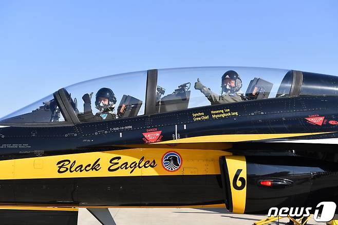 (서울=뉴스1) = 박인호 공군참모총장이 23일 경기 성남시 서울 ADEX 2021 행사장에서 블랙이글스 조종사와 에어쇼를 위해 T-50B 항공기에 탑승해 엄지손가락을 들어 보이며 기념촬영을 하고 있다. (공군 제공) 2021.10.23/뉴스1