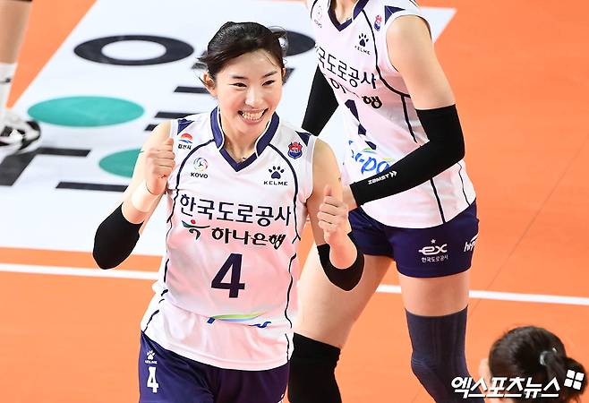 (엑스포츠뉴스 대전, 박지영 기자) 23일 오후 대전 충무체육관에서 열린 '2021-2022 도드람 V리그' 여자부 KGC인삼공사와 한국도로공사의 경기, 한국도로공사 전새얀이 득점 후 환호하고 있다.