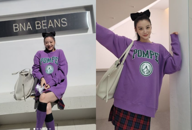 사진에는 보라색의 오버핏 맨투맨과 체크무늬 스커트, 무릎 아래까지 오는 니삭스를 신고 나들이에 나선 혜림의 모습이 담겼다. 검정색 왕리본으로 포인트를 줘 사랑스러운 매력을 한층 더해 눈길을 끈다.