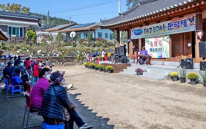 [증평=뉴시스] 강신욱 기자 = 솔마루예술봉사단이 23일 충북 증평군 증평읍 남하리 증평민속체험박물관에서 열린 1회 북치고 장구치는 둔덕제에서 방문객들이 관람하는 가운데 공연하고 있다. (사진=증평군 제공) 2021.10.23. photo@newsis.com