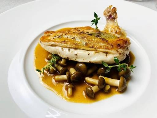 ① 닭고기는 껍질을 3분의 2 정도 벗겨 준 후 버터 1티스푼을 섞은 씨겨자 머스타드와 다진 바질을 버무려 준 후 다시 껍질을 덮어준다. 그리고 소금간을 한다.② 팬에 올리브오일을 두르고 열이 올라오면 닭고기 껍질쪽을 먼저 약한 불에서 천천히 구워준다.③ 뒤집개로 살짝 눌러주며 껍질이 노릇하게 될 때까지 익혀준다. 껍질이 갈색이 되면 뒤집어 준 후 손질한 백만송이 버섯과 버터를 추가한다.④ 화이트 와인을 넣고 닭가슴살의 내부 온도가 60도가 넘으면 꺼낸다. 로즈마리와 후추를 뿌려 풍미를 더해준다.