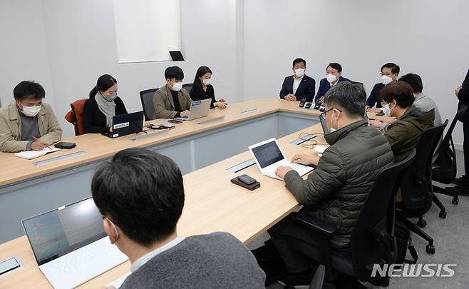 [울산=뉴시스] 배병수 기자 = 윤석열 국민의힘 대선 경선 예비후보가 23일 오후 울산 남구 국민의 힘 울산시당 회의실에서 열린 지역 언론인 간담회를 가지고 있다. 2021.10.23. bbs@newsis.com