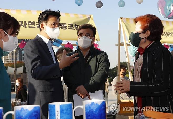 (서울=연합뉴스) 박성수 송파구청장이 23일 오후 올림픽공원 평화의문 광장에서 열린 송파 사회적경제 장터 '송사장&사회적경제 놀자!' 행사를 찾아 사회적경제 기업인들을 격려하고 있다. 2021.10.23 [송파구 제공, 재판매 및 DB 금지]